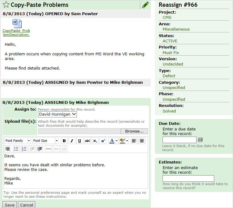 - A record was assigned to a ‘wrong’ team member and another person should be responsible for fixing it.
