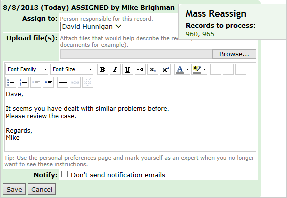 Step two. Select the user to whom you would like to reassign the record and/or attach a new file and/or add more detaisl. Click the Save button to complete the reassignment.
